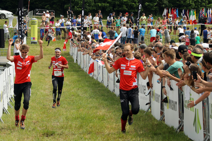 CERNA VODA/CZECH REPUBLIC, 28.05.2016 – European Champion relay men: Team Switzerland 2 with Florian Howald, Baptiste Rollier & Martin Hubmann, captured during the relay men at the European Orienteering Championships 2016 in Jesenik, Czech Republic.